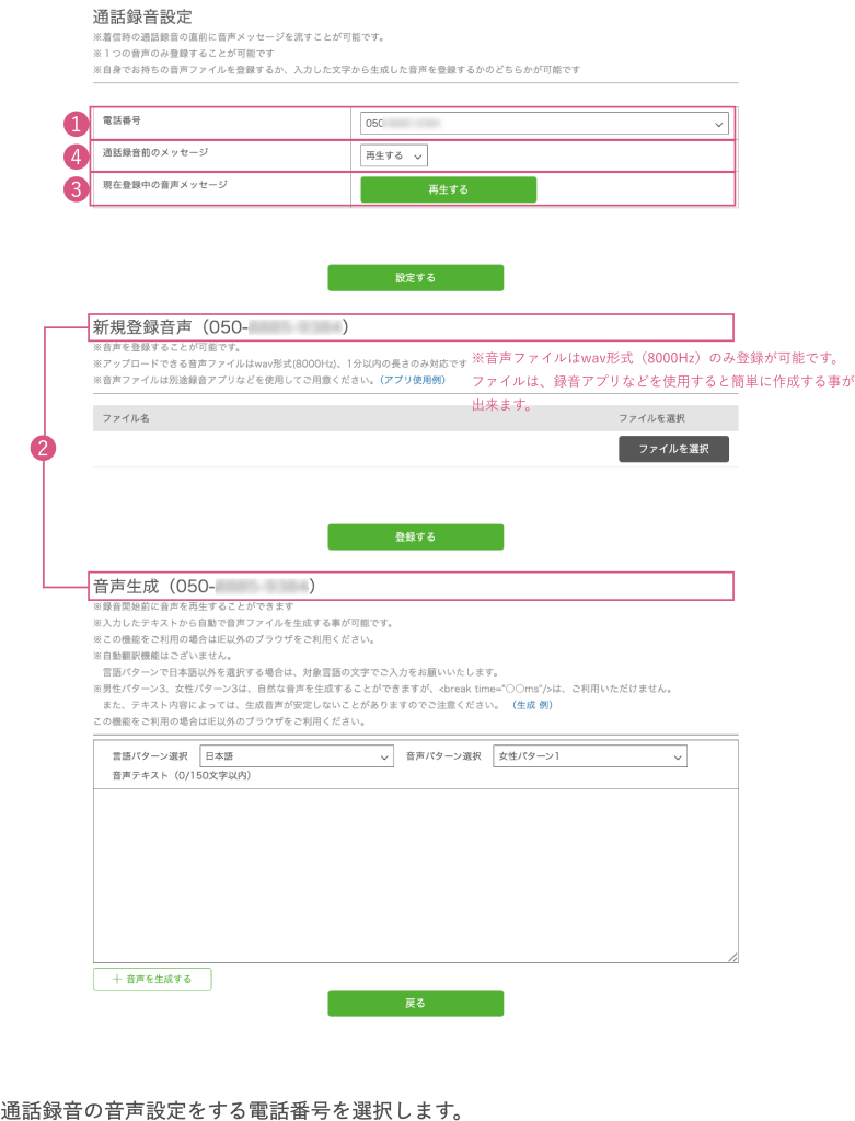 発信側に流す開始音声と、録音が終わった際に流す終了音声を登録します。