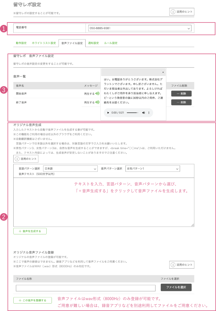 音声ファイルアップロードか、テキストかた音声生成して自動応答用の音声を生成します。