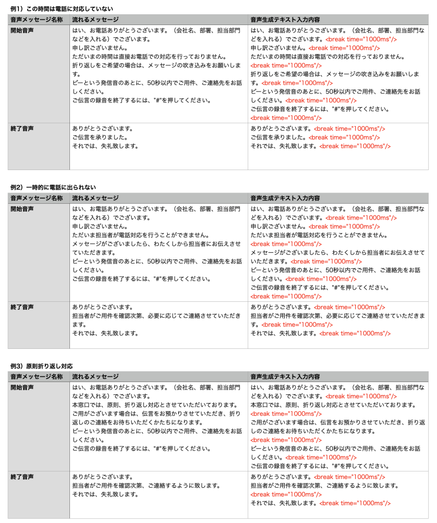 設定する音声は以下の例の様に実際に、電話応対をしている様に設定すると良いでしょう。