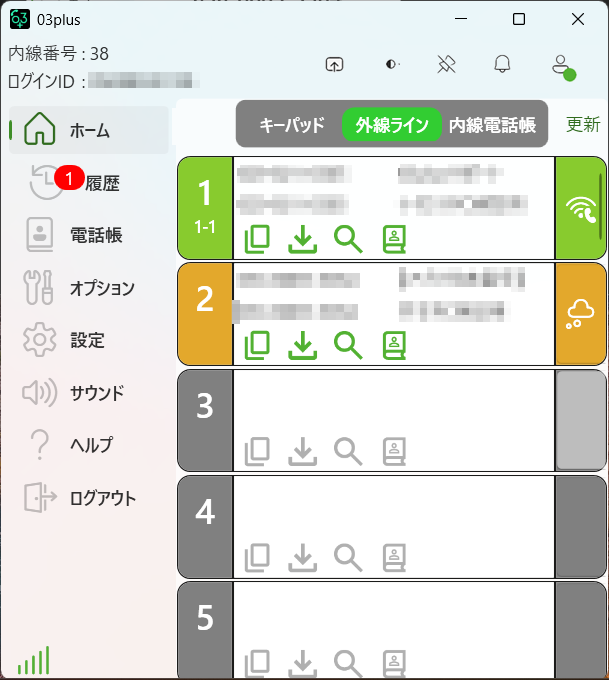 Aさんのアプリ操作方法:保留にすると、ライン画面に保留中の通話がオレンジ色のラインで表示されます。Aさんは「内線電話帳」をクリックし、内線電話帳を開きます。
