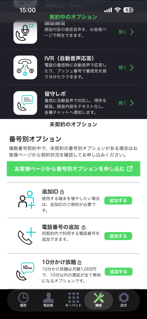 アプリから契約中のオプションを操作したり、契約状況を確認できます。未契約のオプションはアプリから追加する事も可能です。