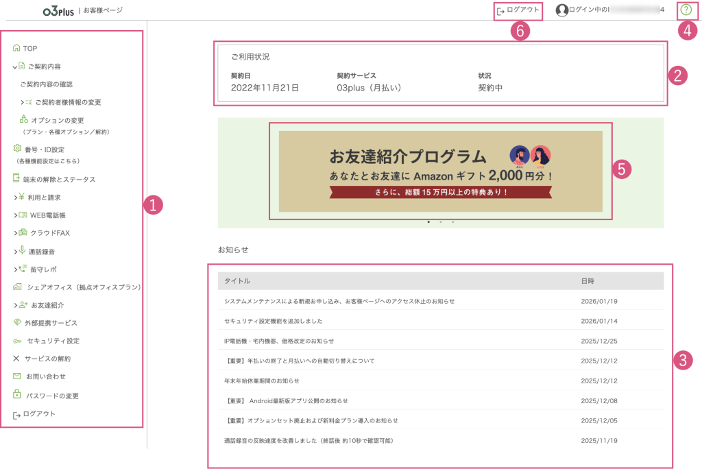契約内容の確認/各種オプション設定/お問い合わせなどを選択して各画面を開きます。