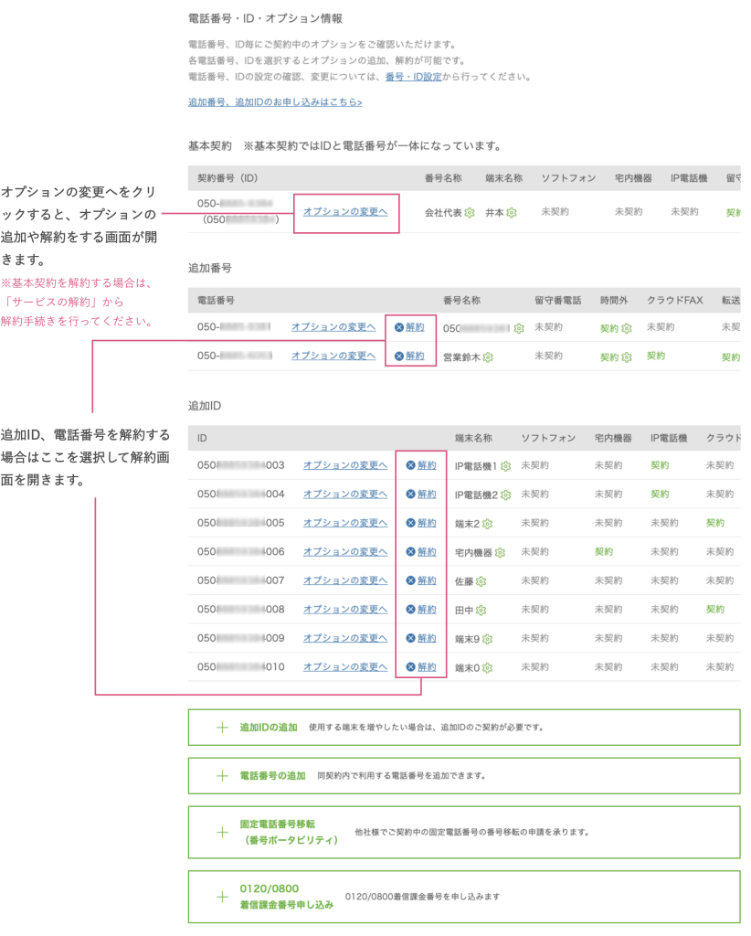 オプションの変更追加、解約をする場合は電話番号またはIDの横にある「オプションの変更へ」をクリックしてオプション変更画面を開いてお手続き可能です。