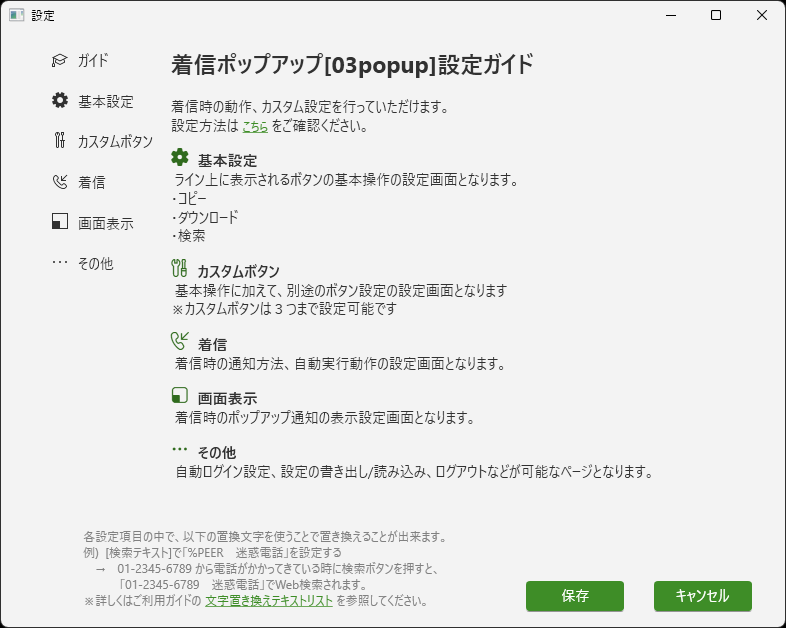 ラインボタンの設定等、着信ポップアップを利用するためには、設定が必要です。着信ポップのガイドをご確認ください。
