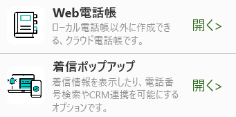 着信ポップアップの[開く>]を押すと、着信ポップアップ機能の設定ページが開きます。