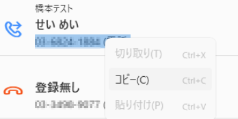 履歴画面で、電話番号を選択するとコピーをすることが可能です。