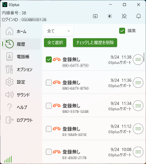 その後[チェックした履歴を削除]をクリックすると、[着信]の履歴のみが削除されます。