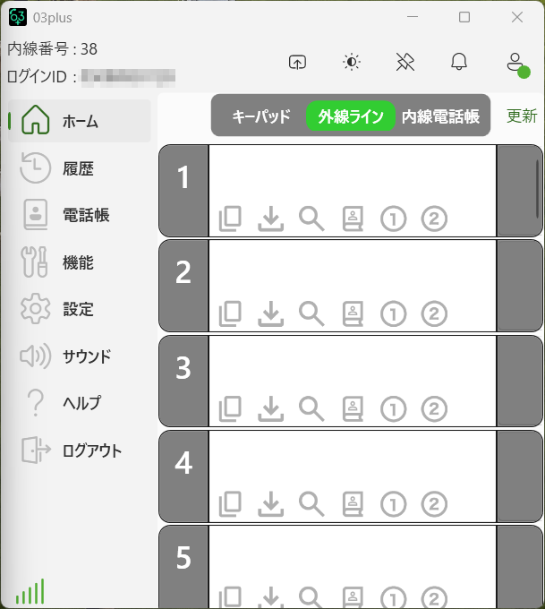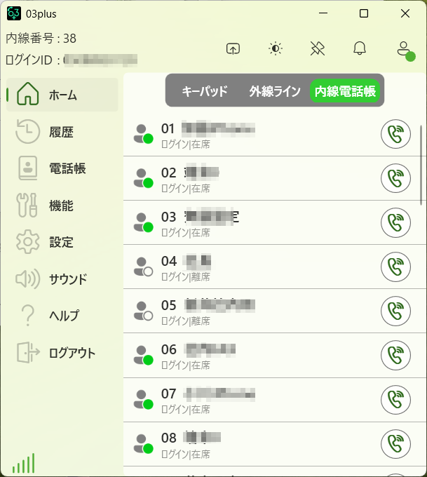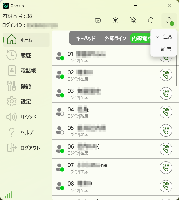 内線電話帳タブを開くと、自分以外の端末の在席/離席のステータスが確認できます。