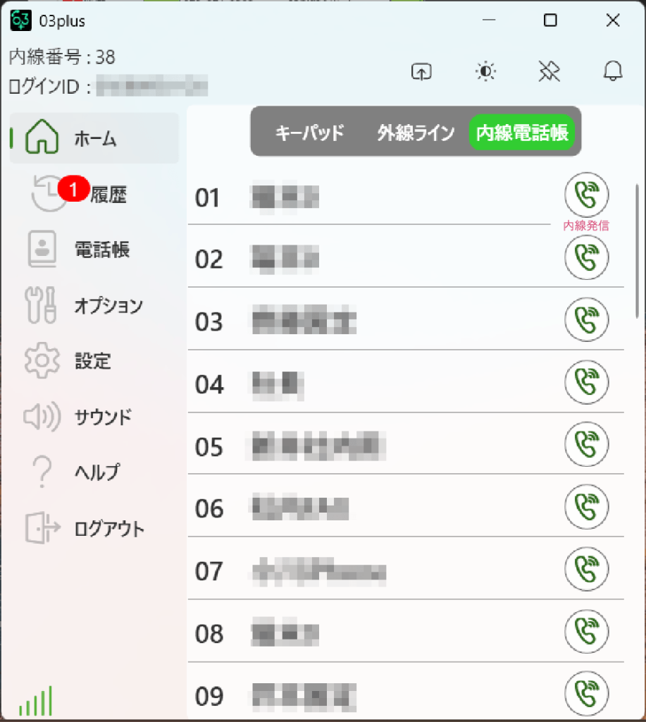 Aさんのアプリ操作方法:内線電話帳から、Bさんの連絡先を選んで、右側の電話マークのボタンをクリックして内線発信をします。