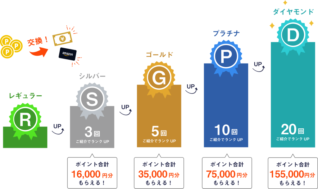 - ランクは紹介数に応じで、自動的にアップしていきます。現在のランクはお客様ページでご確認頂けます