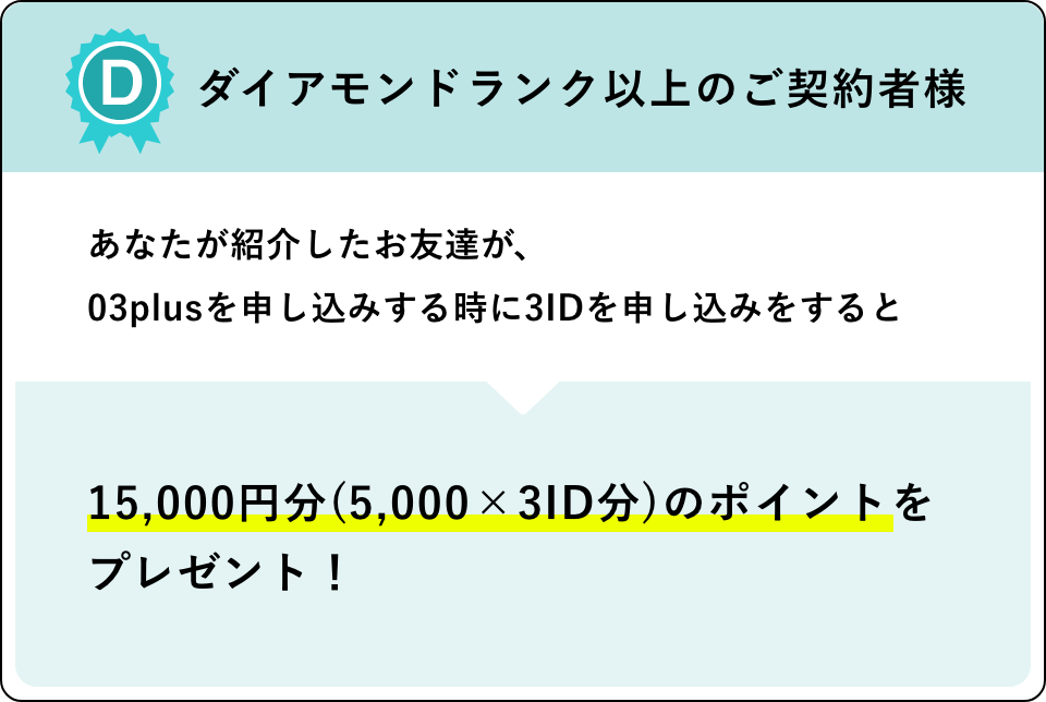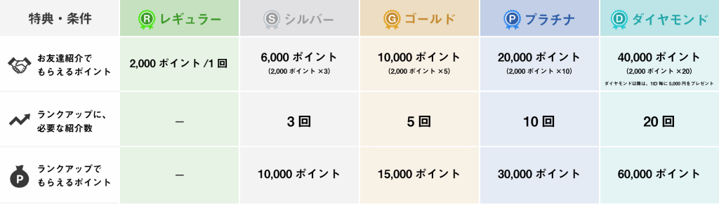 ダイアモンドランクまでは、紹介したお友達のID数に関係なく、紹介した人数分の2,000円分のポイントがプレゼントされますが、ダイアモンドランク以降は、紹介したお友達が契約したID数分のポイントが5,000円分プレゼントされます!